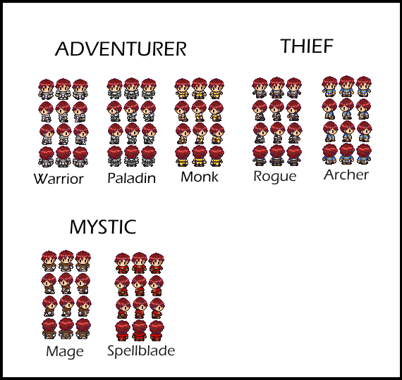 So yeah, this was a decision I was entertaining for a while. However I finally decided on it and so here is the chart. Currently I have it just for the male, which you will notice that he his hair is now missing his bandana and also his red hair is dulled. Yes, this is a change to make them better fit with other sprites in the game. Eventually I will show what both male and female look like afterwards once I finalize all of the changes.